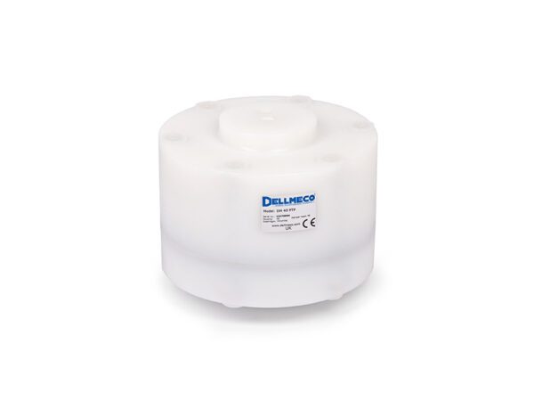 1-1/2″ Dellmeco® air driven pulsation damper. Wetted body construction in Polyethylene c/w PTFE diaphragm. Non-wetted Polyethylene air side (no oil design). Connections 1-1/2″ BSP.