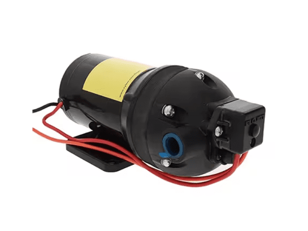 The Flojet Triplex T201F-318S-1P is a 12V industrial diaphragm pump well suited to RV and motorhome water systems, as well as a range of other applications including liquid transfer, spraying, cooling, circulation, filtration, and dispensing. It delivers 2 GPM at up to 60 PSI, self-primes up to 8 ft, and can run dry without damage. An integrated pressure switch cuts the pump off automatically at 60 PSI.