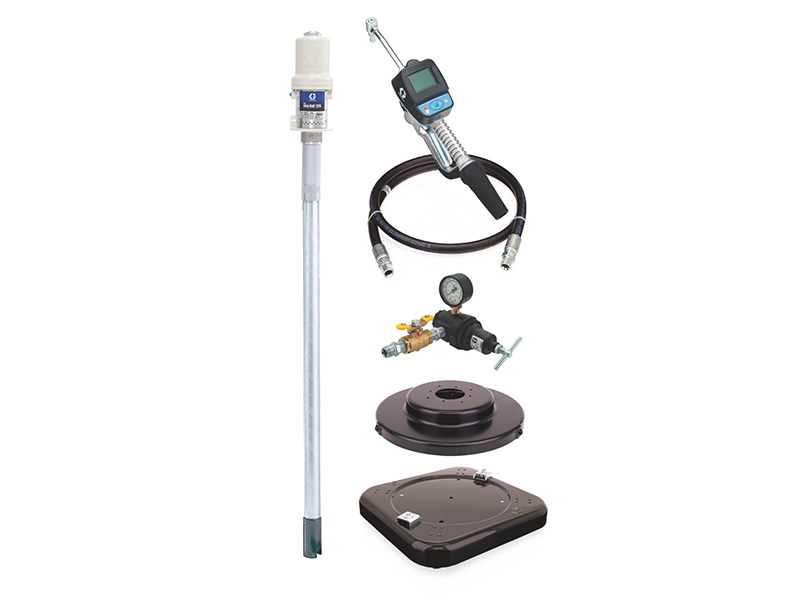 Graco – 246903 – Oil Piston Pump – Lube Truck Package comes complete with a 248097 pump from the Mini Fire-Ball 225 series. The pump has a 1 1/2″ NPT (F) fluid inlet with a 3:1 ratio. Kit also includes: Drum Cover, Air Regulator Kit.