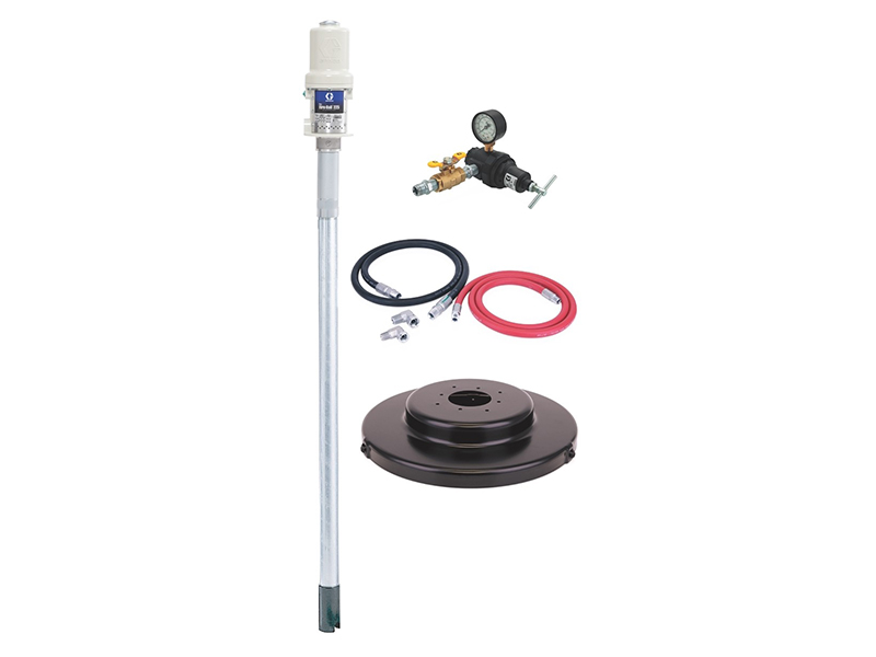 Graco – 246904 – Oil Piston Pump Package comes complete with a 248097 pump from the Mini Fire-Ball 225 series. The pump has a 1 1/2″ NPT (F) fluid inlet with a 3:1 ratio. Kit also includes: Hose Installation Kit, Drum Cover, Air Regulator.