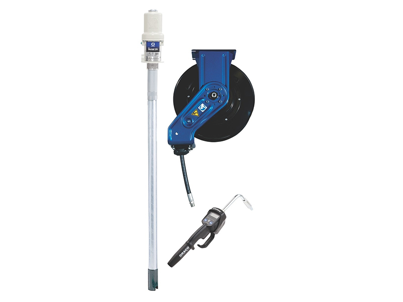 Graco – 248622 – Oil Piston Pump Package comes complete with a 248097 pump from the Mini Fire-Ball 225 series. The pump has a 1 1/2″ NPT (F) fluid inlet with a 3:1 ratio. Kit also includes: Bung Adapter, Down Tube, SD Series Reel, Fluid Hose, Meter.