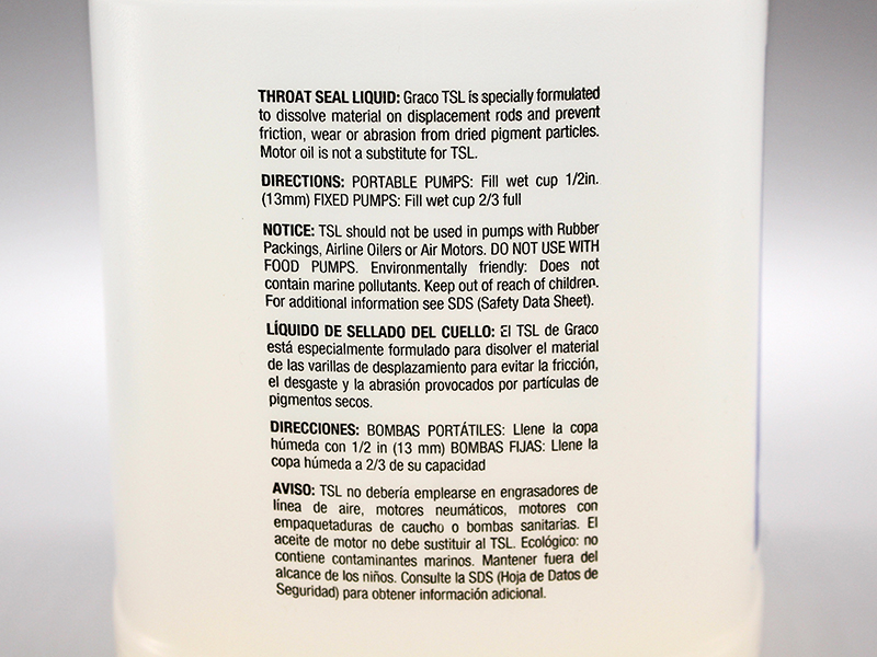 206996 Throat Seal Liquid (TSL) prevents paint and coatings from drying onto the displacement rod and packings, extending the life of the pump.