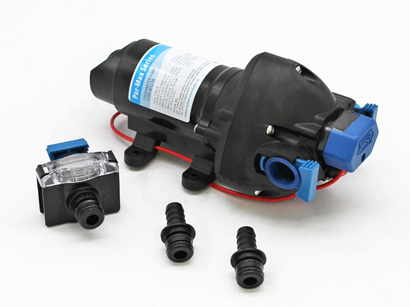 The Jabsco Par‑Max 3 is a compact 12 V freshwater pressure pump perfect for boats, RVs, and motorhomes, delivering reliable on‑demand water to galley sinks, showers, and multiple outlets. It provides about 11 L/min (3 GPM) open flow and has a max operating pressure and cut off of 40 PSI (2.8 bar). It features an integrated sealed pressure switch for automatic operation. Built with a 3‑chamber Santoprene diaphragm and EPDM check valves, the pump is self‑priming, dry‑run capable, and includes quick‑connect 1/2″ hosebarb ports and an inline strainer for easy install and quiet, smooth performance.
