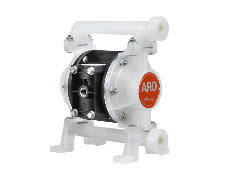 The Aro PE03P-BRS-PTT-AD0 polypropylene diaphragm pump features flow rates of up to 40.1 LPM and multiple ports. The pump has PTFE diaphragms, PTFE balls and polypropylene seats.