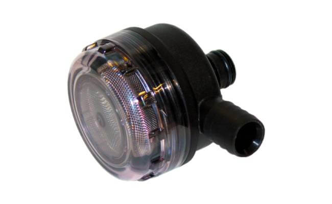 Flojet fresh water pump inlet strainer – 1740023 – protects electric pumps by preventing unnecessary pump breakdowns caused by particles in the water. Transparent housing allows instant inspection. Screw off top allows quick in-place cleaning and removal of debris.