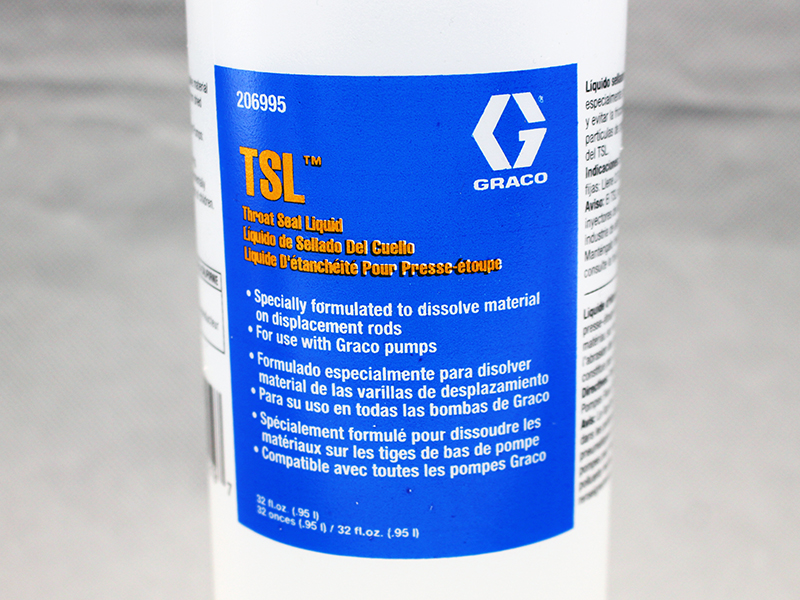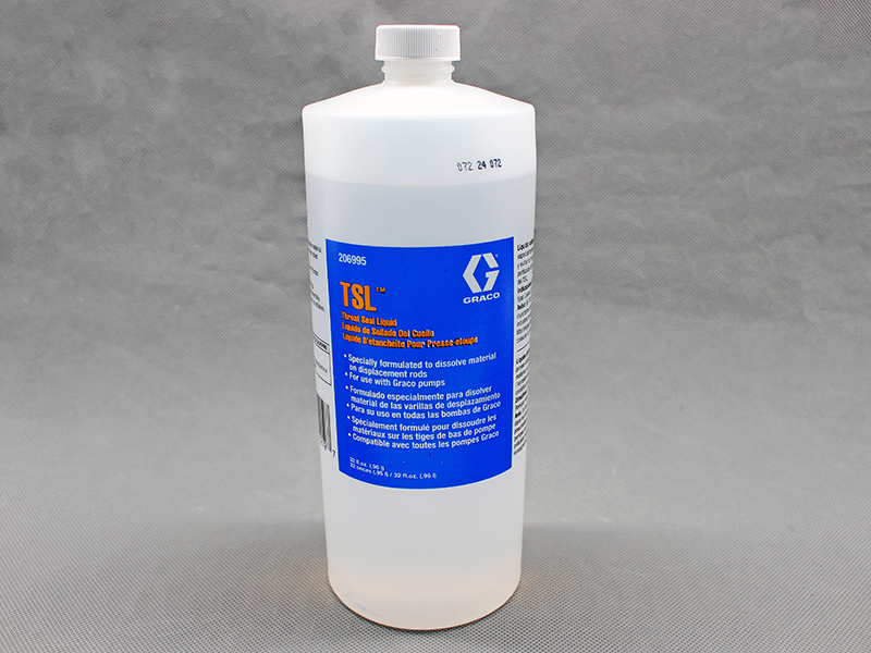 206995 Throat Seal Liquid (TSL) prevents paint and coatings from drying onto the displacement rod and packings, extending the life of the pump.